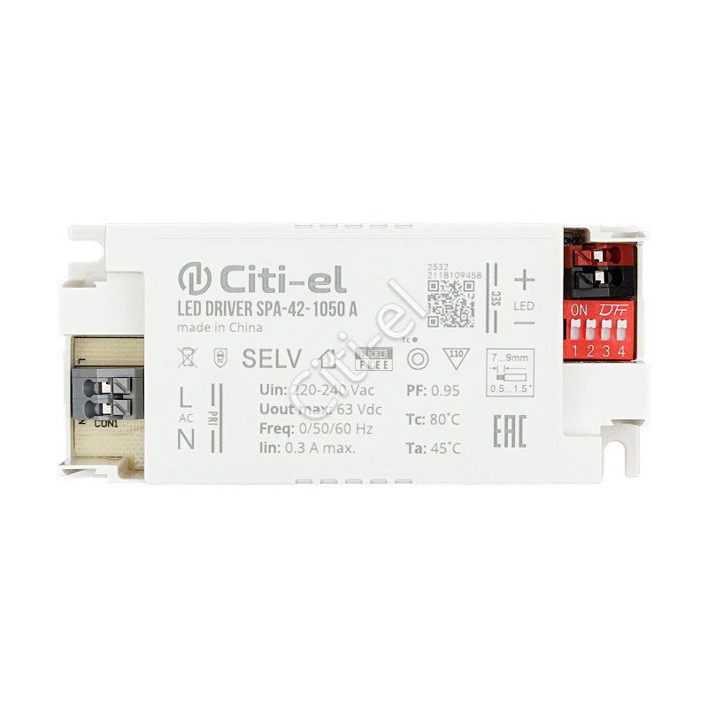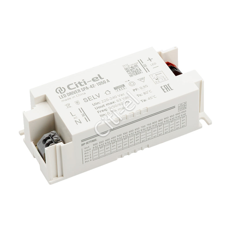 Регулируемый источник тока для светодиодных светильников. Гальванически развязан, Class II. Пульсации света ≤ 1%. Степень защиты оболочки от пыли и влаги – IP20. Гарантия 5 лет.