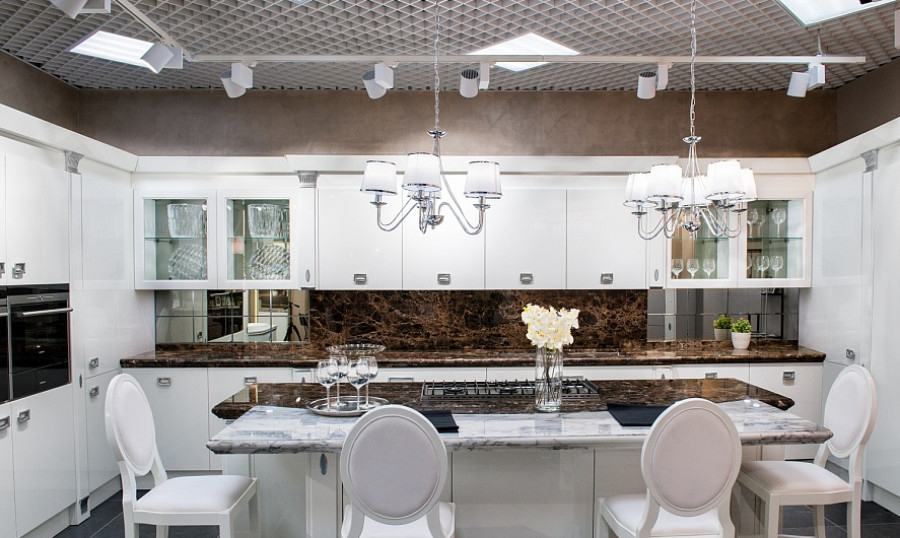 Кухни в итальянском стиле - символ домашнего уюта и тепла. Компания Интера Лайтинг установила в одном из салонов мебели Scavolini акцентное освещение, которое позволило подчеркнуть качество и глубину материалов. Дополнительный объем помещению придали широкие углы отражателей на трековых светильниках, которые равномерно осветили кухонные гарнитуры, избегая неприятных «пересветов» на глянцевых поверхностях мебели.